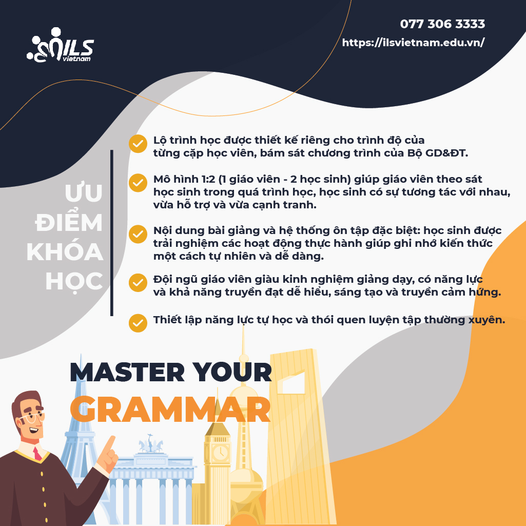 Để có một nền tảng tiếng Anh vững chắc, thuận lợi phát triển các kỹ năng Nghe-nói-đọc-viết cũng như vượt qua các kỳ thi quan trọng của chương trình giáo dục phổ thông, việc nắm vững kiến thức ngữ pháp là không thể bỏ qua. Nhận thức được tầm quan trọng của việc nắm chắc kiến thức ngữ pháp, Trung tâm Anh ngữ ILS Vietnam cho ra đời Chương trình bổ trợ ngữ pháp trực tuyến phục vụ nâng cao kết quả học tập ở trên lớp, các kỳ thi ở trường và các kỳ thi chuyển cấp cũng như phát triển các kỹ năng thực hành tiếng.